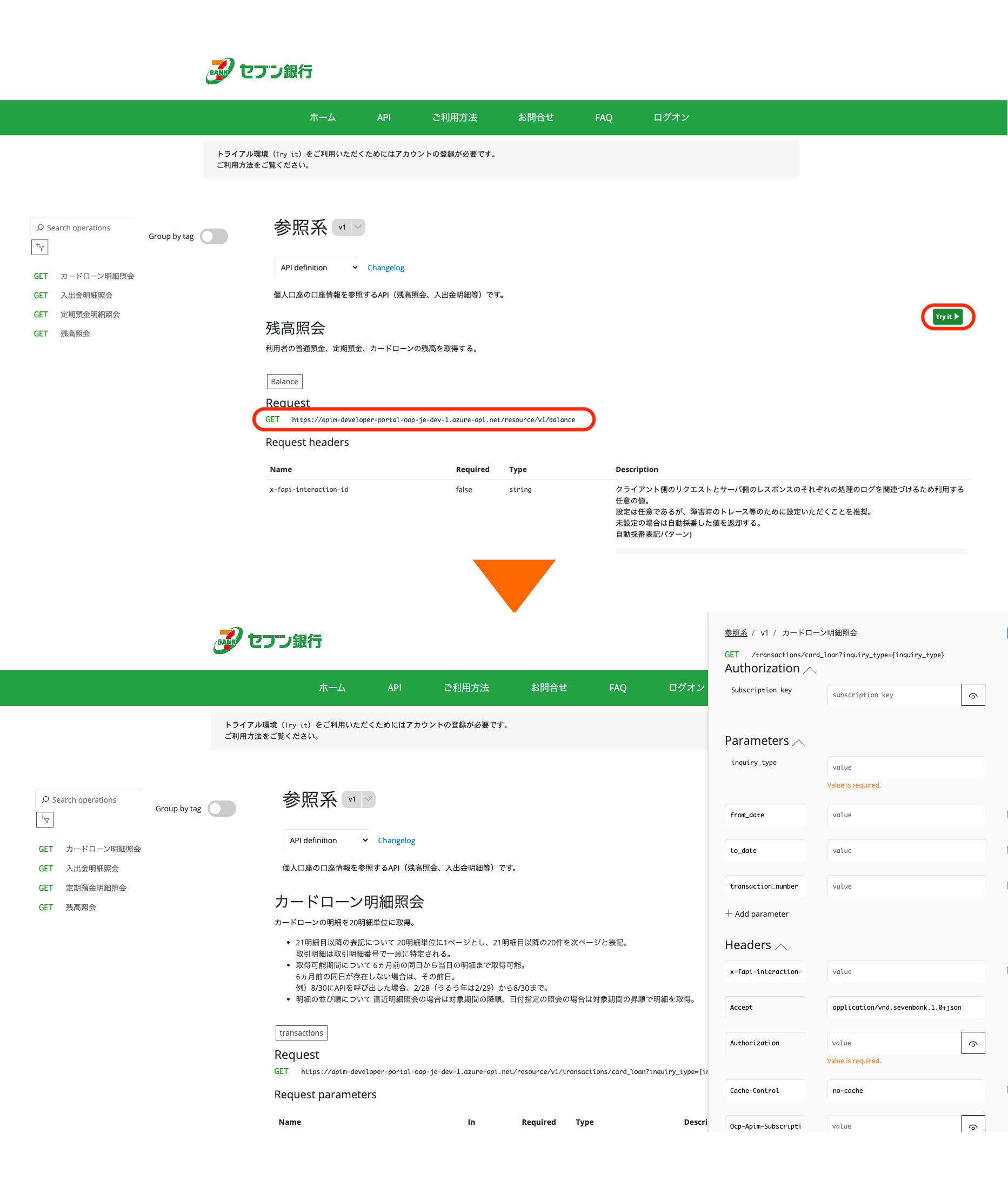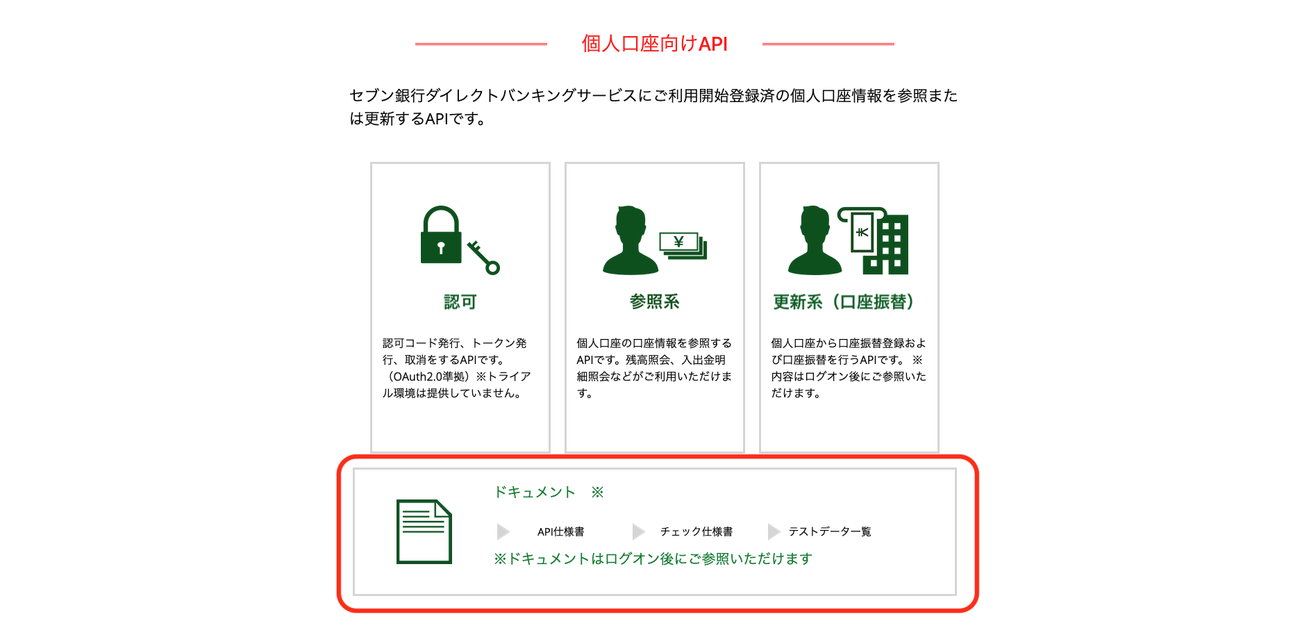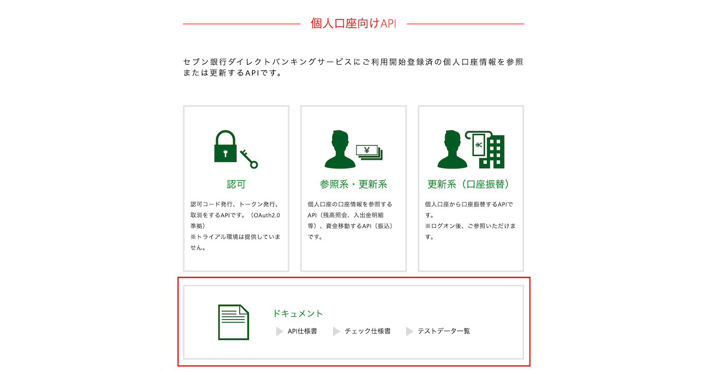 ホーム画面または画面上部のAPIタブから個人口座向けAPI、法人口座向けAPIを選択し、仕様をご参照ください。