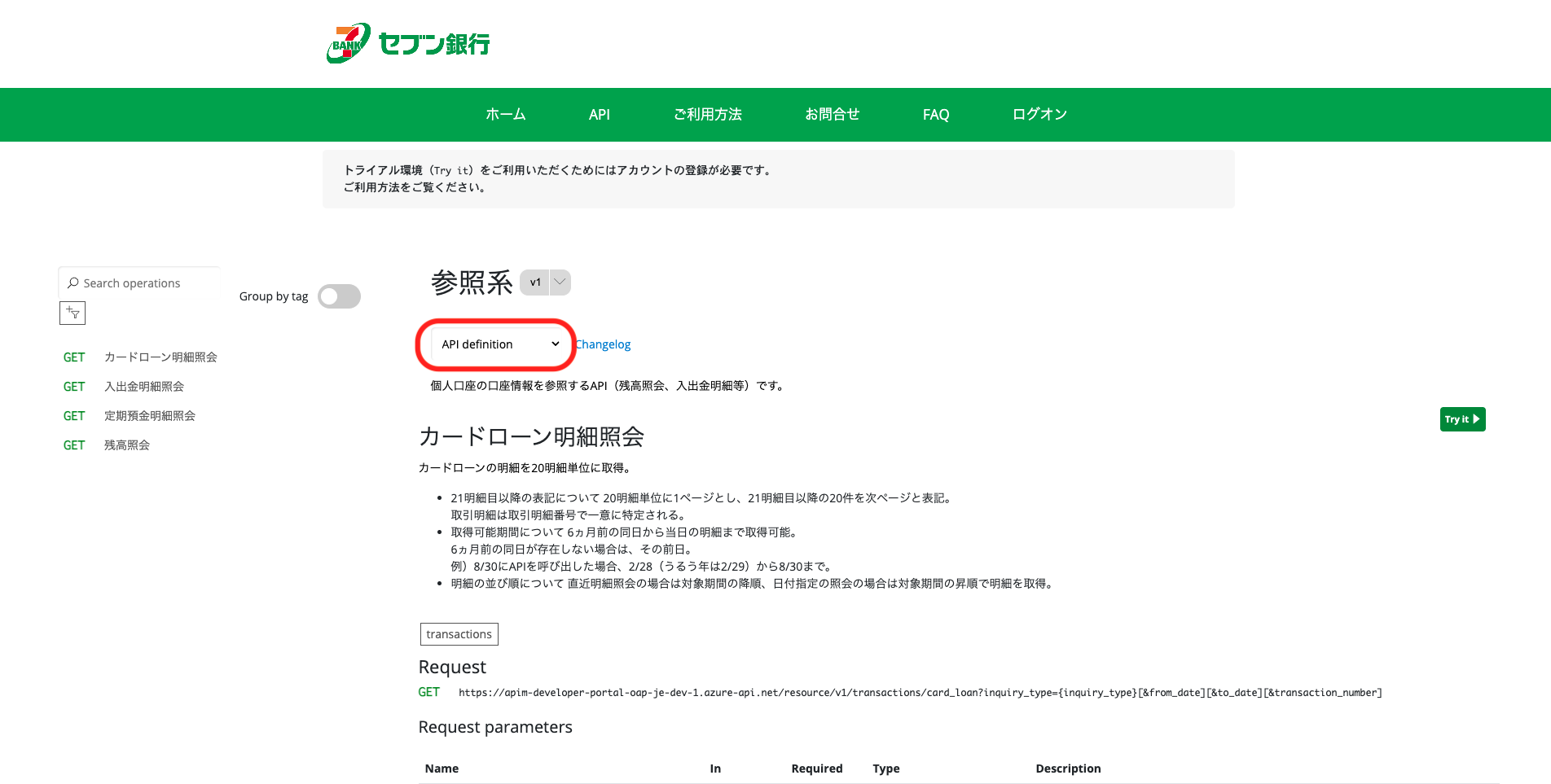 APIの仕様ページのAPI definitionボタンを押下することで、ダウンロードできます。(JSON形式)